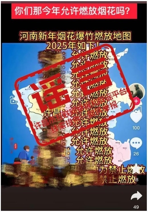 近日,河南省许昌市委网信办接群众举报,短视频账号“记录美好的时光”发布视频信息“河南新年烟花爆竹燃放地图2025年如下!许昌:允许燃放”。经向许昌市应急管理局等相关部门核实,该视频信息为不实信息。