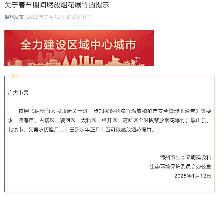 辽宁锦州允许燃放烟花爆竹?官方回应