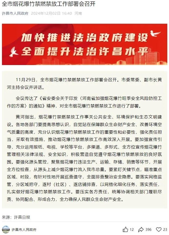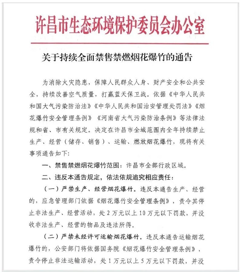 许昌市11月召开了烟花爆竹禁燃禁放工作部署会,会议传达了《省安委会关于印发(河南省加强烟花爆竹旺季安全风险防控工作的方案〉的通知》精神,对全市烟花爆竹禁燃禁放工作进行了部署。许昌市生态环境保护委员会办公室发布的《关于持续全面禁售禁燃烟花爆竹的通告》明确指出禁售禁燃烟花爆竹范围为许昌市全部行政区域。