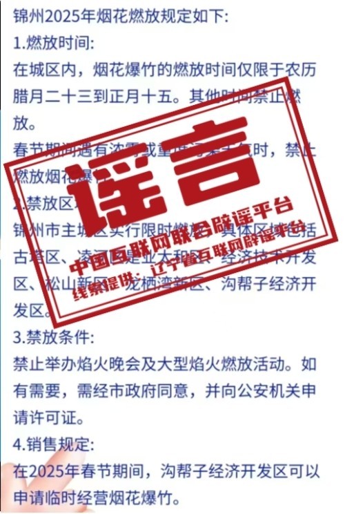 近日市民发布的关于辽宁锦州2025年烟花燃放规定为假消息,具体请看官方消息。